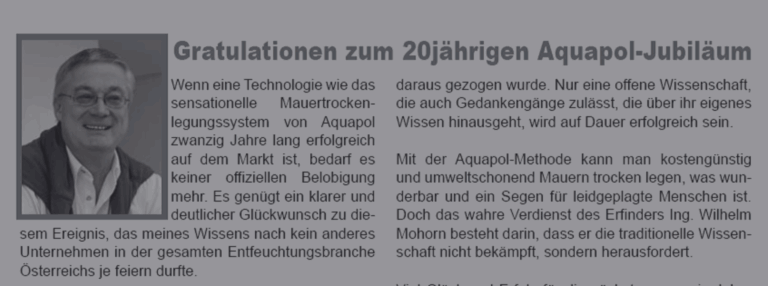Auszug aus dem AQUAPOL® Jubiläumsmagazin 2005 mit und von Hans Kronberger Hans Kronberger: „Wenn eine Technologie wie das sensationelle Mauerentfeuchtungssystem von AQUAPOL® zwanzig Jahre lang erfolgreich auf dem Markt ist,…