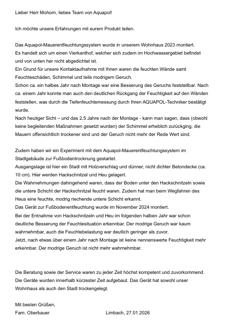 „Das AQUAPOL® Mauerentfeuchtungssystem wurde in unserem Wohnhaus 2023 montiert. Schon etwa ein halbes Jahr nach der Montage war eine Verbesserung des Geruchs feststellbar. Nach rund einem Jahr konnte man auch den deutlichen Rückgang der Feuchtigkeit an den Wänden feststellen.
