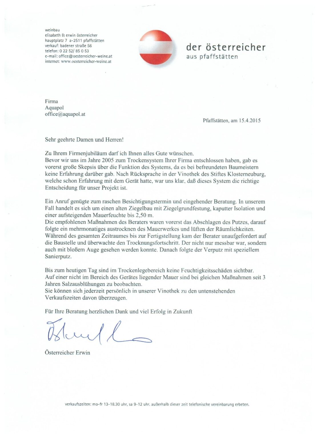 Nach der Trockenübergabe im Jahr 2007 sind im Entfeuchtungsbereich keine Feuchteschäden mehr sichtbar. Überzeugen Sie sich selbst und besuchen Sie den Verkaufsraum der Vinothek. www.oesterreicher-weine.at